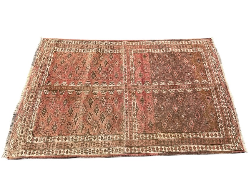 A Turkmen wool rug woven with four panels of gul motifs on a red field, within stylised flowerhead borders. (41in x 63in)