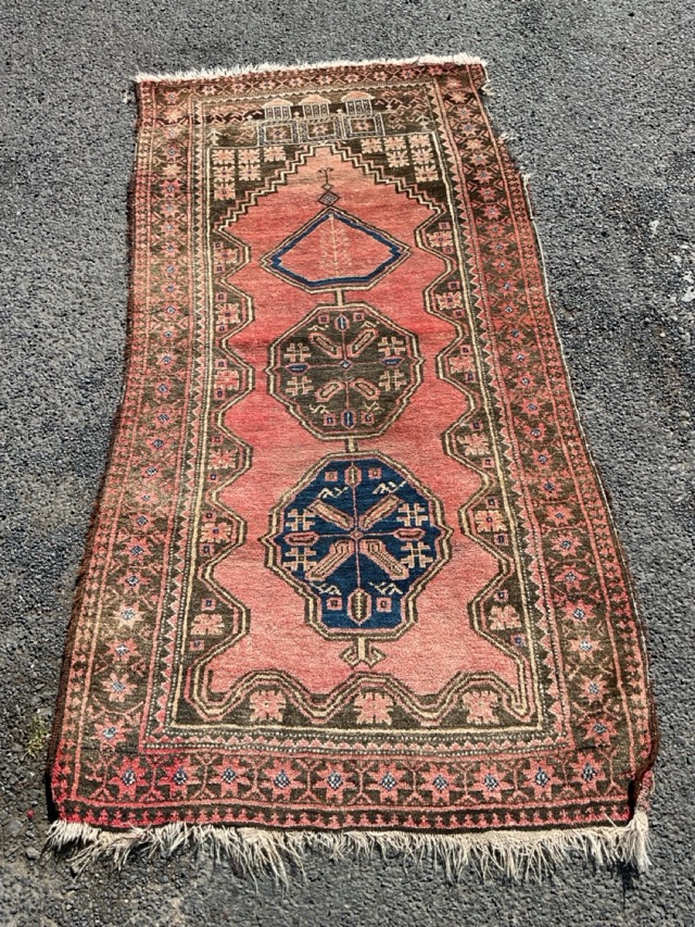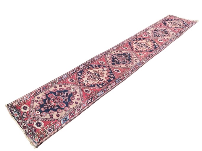 A Persian Heriz wool runner woven with six hexagonal medallions amid gul motifs on a red field, within floral borders. (31.75in x 177in)