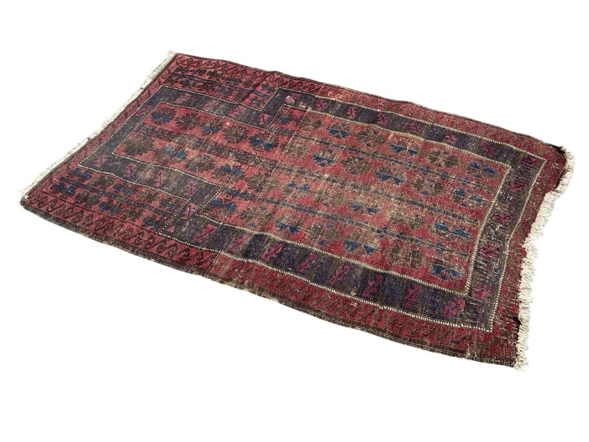 A Baluch wool prayer rug woven with rows of flowerheads on a red field within a mihrab and meandering foliate scrolled borders. (36.5in x 56in)