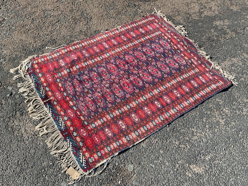 An Afghan Turkmen style wool rug woven with two rows of five gul motifs on a red field within lozenge and chequered borders. (40in x 22in)