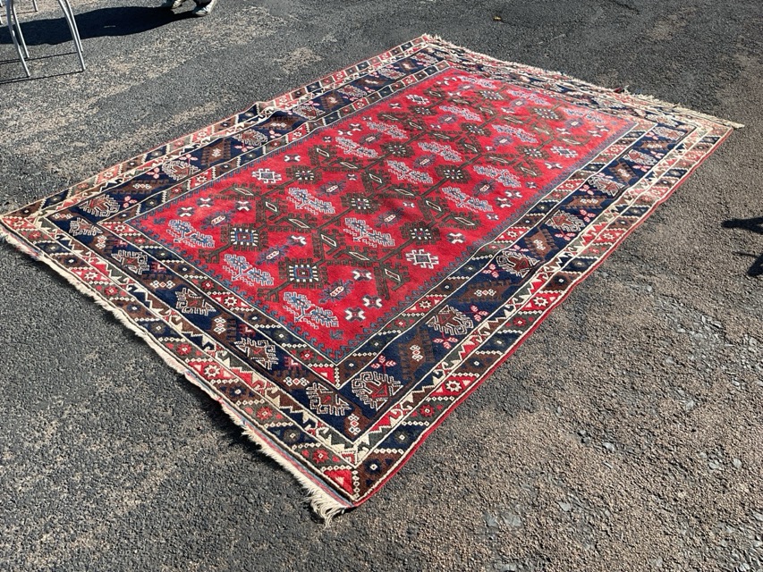 An Ushak wool rug woven with geometric floral pattern on a red field within a formal floral border. (60in x 42in)