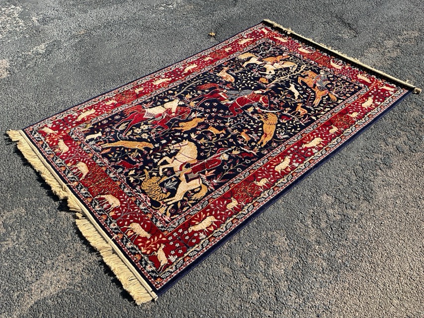 A Kashmiri style wool rug woven with lion hunt scene of mounted huntsmen and animals amid trees and flowers on a black field, within a border of deer amid blossoming trees. (49.75in x 78in)