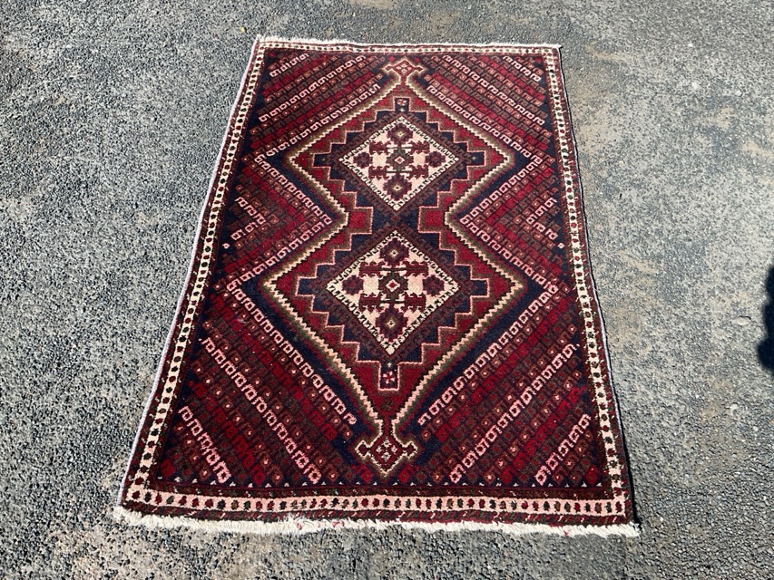 A Persian Shahbabak wool rug woven with two lozenge medallions on a dark blue field with diagonal lines of boteh motifs within geometric borders. (31in x 48in)