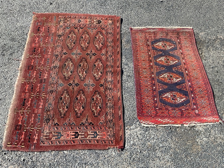 A Turkmen Arabachi wool rug woven with three rows of gul motifs on a red field within stylised leaf borders with a deep border of plant motifs to one side. (46in x 31in) A Turkmen wool rug woven with four gul medallions on a dark blue field within stylised flowerhead borders. (34in x 22in) (2)