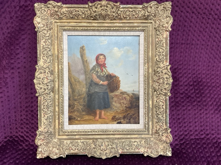 JH Mole, C19th oil on board, a fisherlady on the shore with basket, titled and signed to verso A Cullercoats Fisher Girl, dated 1839 and with cutting detailing the artist, in gesso foliate scrolled frame. (8.5in x 10.25in)