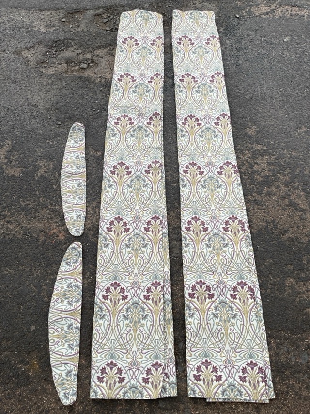 A pair of lined art nouveau style curtains, having stylised flowerhead sprays on a cream ground, with matching tie-backs. (90in) (2)