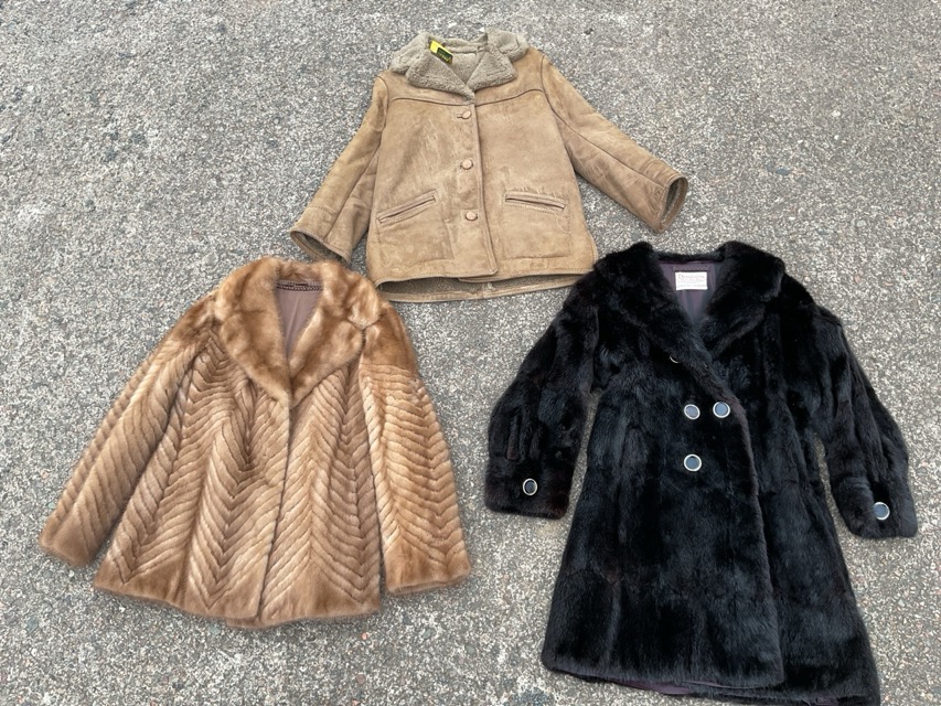 A ladies half-length chevron patterned mink jacket with satin lining; a Dominion Fur Co three-quarter length musquash coat with taffeta lining; and a Woolbaron sheepskin coat with fleece lining. (3)