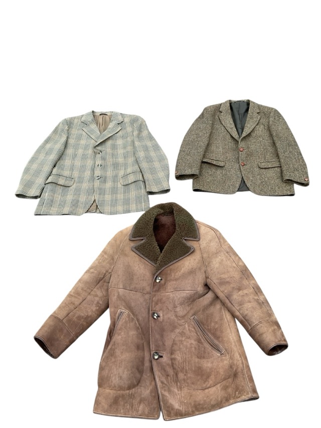 A Grendale Harris tweed jacket with leather knot buttons and vent pockets; a Hea Tona sheepskin three-quarter length coat with fleece lining and horn buttons; a Dunn & Co checked wool worsted jacket with horn buttons. (3)