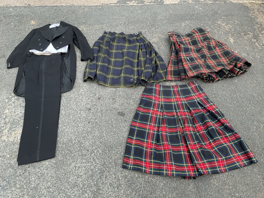 A white tie evening tailcoat and trousers with white satin double-breasted waistcoat; two Pringle tartan wool kilt skirts; and a dress kilt with leather strap fastenings. (4)