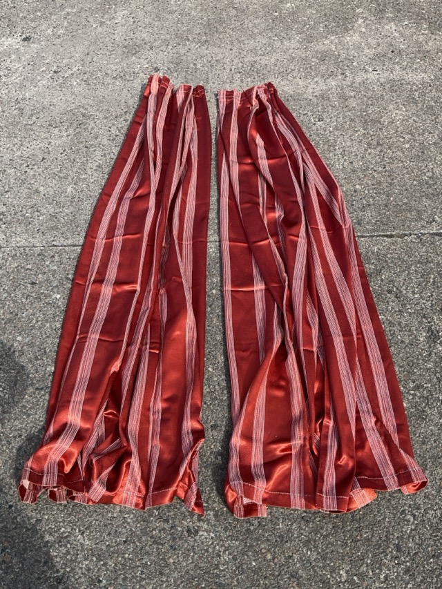 A pair of unlined heavy satin curtains, woven with stripes on red ground. (75in) (2)