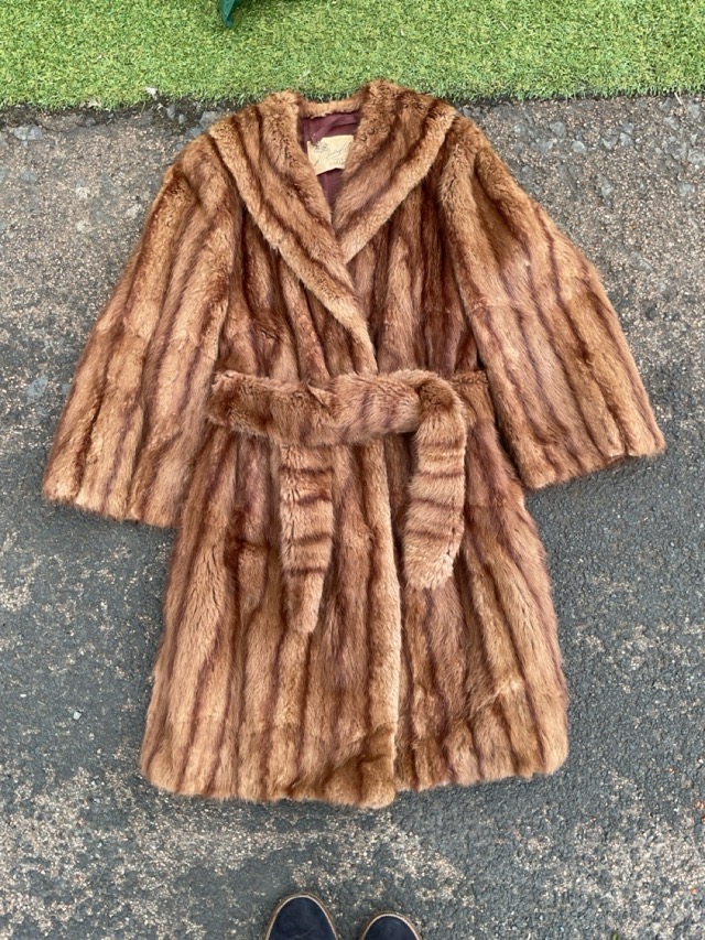 A three-quarter length stranded mink coat with tie belt and satin lining by A Bullough & Co Ltd of Carlisle.