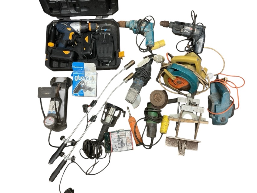 Miscellaneous power tools & electricals - a boxed MacAllister drill, sanders, pumps, gas torches, drills, angle grinder, rip-saws, etc. (A/F) (A lot)