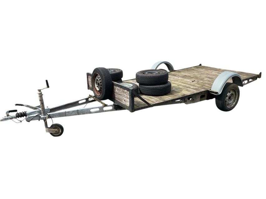 A large rectangular flatbed trailor with boarded platform on angleiron frame, complete with electrics, spare wheels, brakes, jack jockey wheel, etc. (128in x 63.5in)