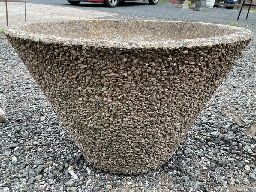 A contemporary wide composition stone garden urn of circular tapering form with pebbledashed exterior. (25.75in x 16.5in)
