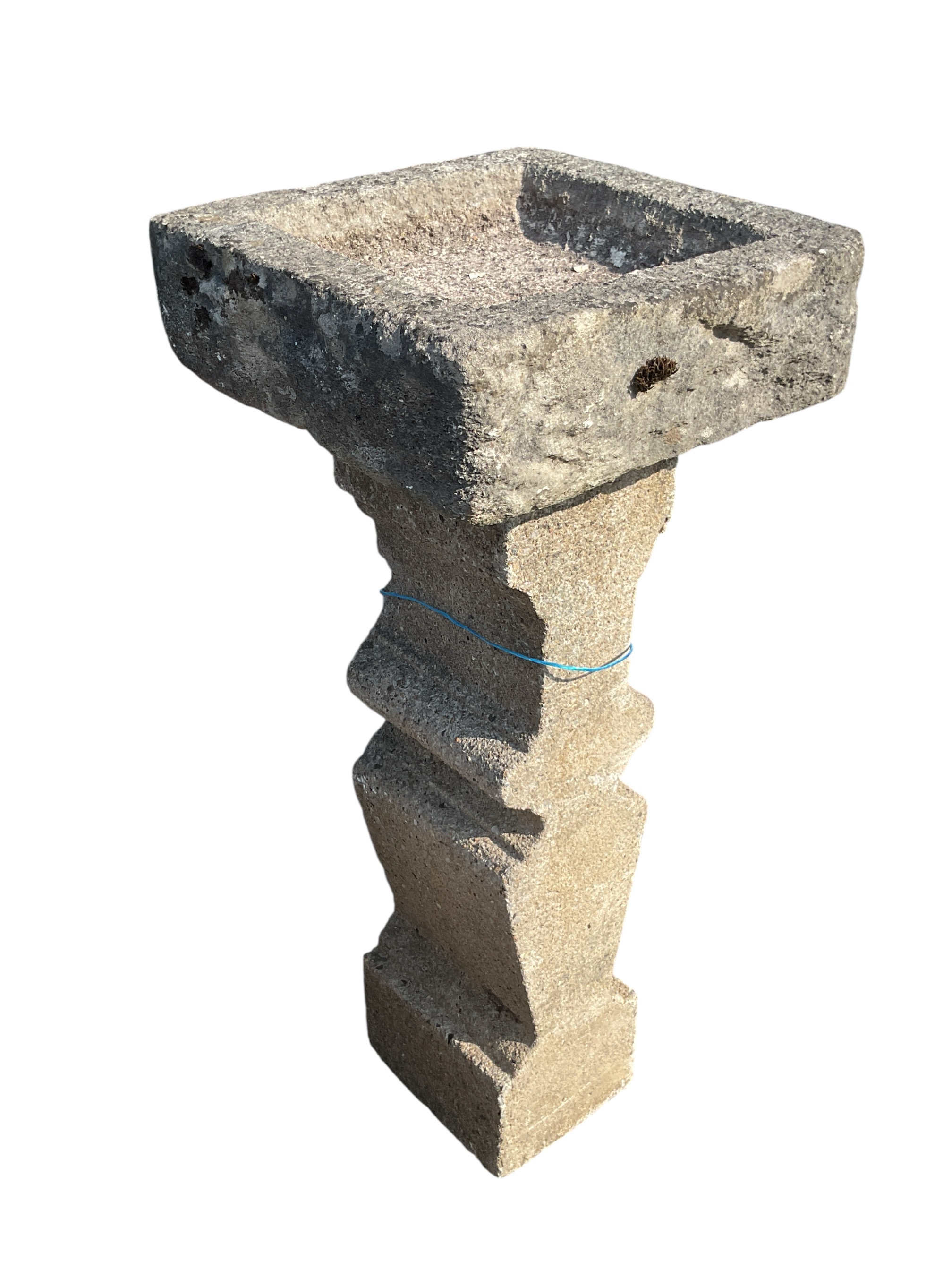 A composition stone birbath with square bowl on an associated baluster shaped rectangular column. (28in)