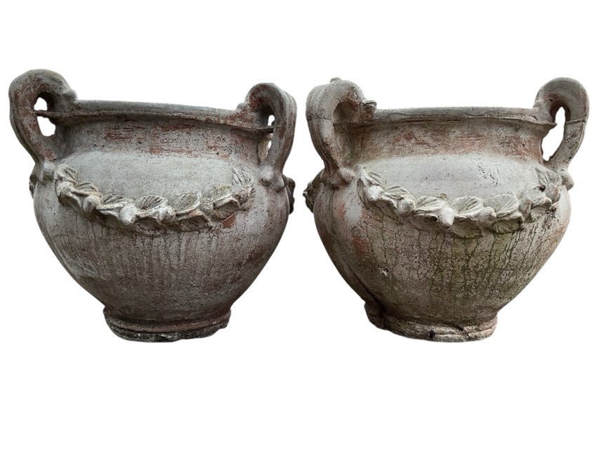 A pair of composition stone Grecian style garden pots, the bulbous vessels with swagged decoration each having three moulded handles to tubular rims. (15.5in) (2)