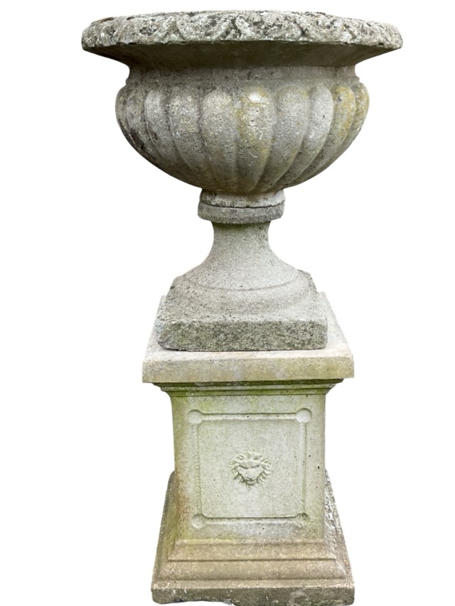 A composition stone garden urn on stand, the traditional fluted pot with egg & dart moulded rim on socle with square base, the square column support with lionhead panels on moulded plinth. (36.25in)