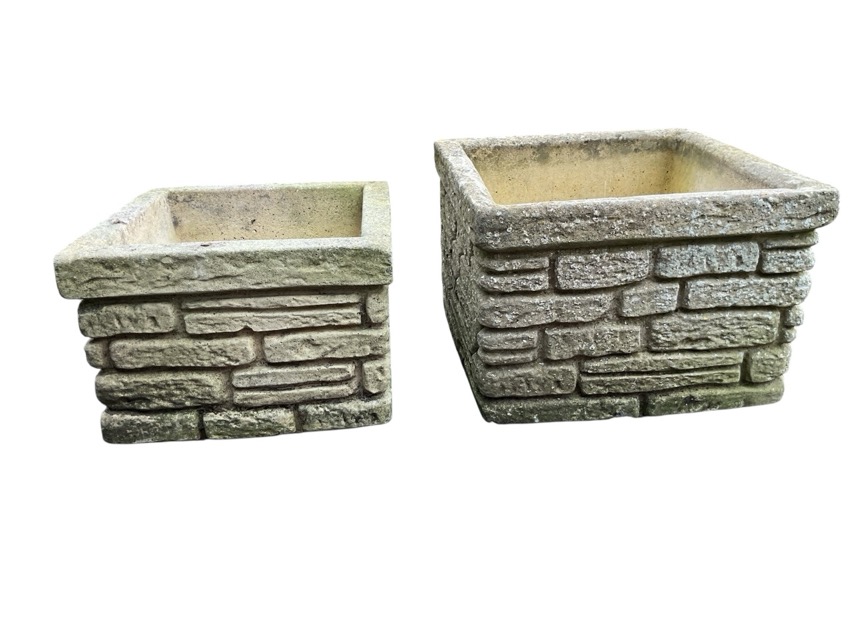 A graduated pair of square composition stone garden planters cast with faux stonework. (11.5in & 9.5in) (2)
