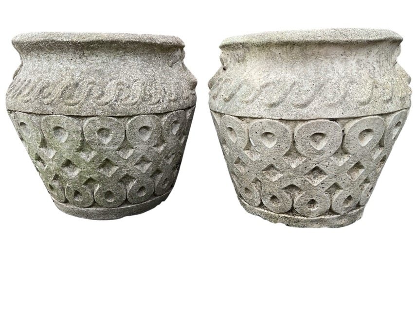 A pair of composition stone garden urns cast as pots with waisted necks having handles, above tapering bodies of interlaced design. (15.75in) (2)