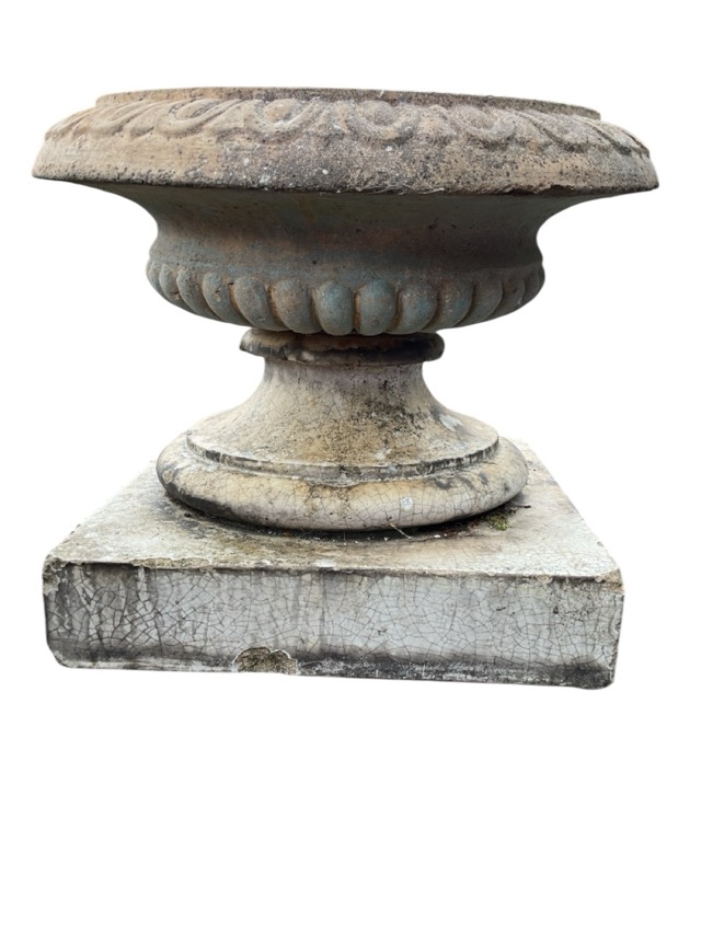 A classical campana style garden urn with overhanging, egg & dart rim above fluted body on circular moulded base, raised on square plinth. (21in x 18in)