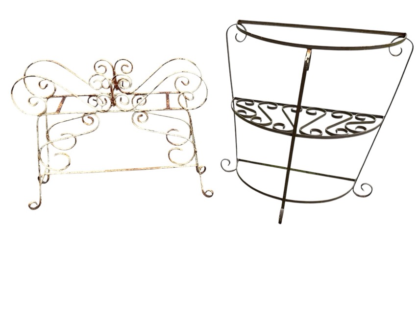 A painted wrought iron plant trough stand with scrolled decoration; and a wrought iron D-shaped conservatory table with scrolled supports and mid-tier shelf - lacking top. (2)