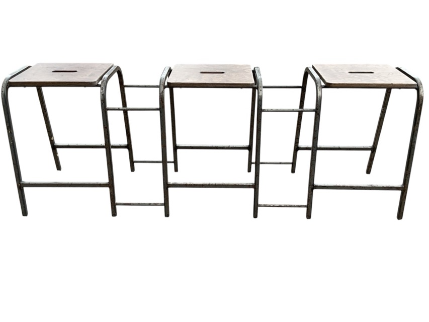 A rectangular 5ft bench of stools with wood seats on hooped square supports, the three joined by rod stretchers. (61.5in)