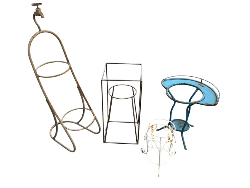 Four miscellaneous plant pot stands - twin apertures with faux tap, plain square, scrolled single pot, and painted with apron shelf. (4)