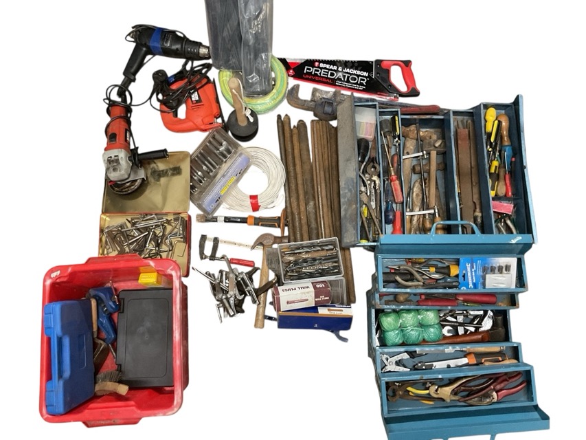 Miscellaneous tools – a boxed food chopper, pliers, an alarm pack, a pump, spanners, levels, sheep shears, files, riveters, hammers, a bench grinder, floodlights, boxed kitchen taps, a camping stove, etc. (A lot)
