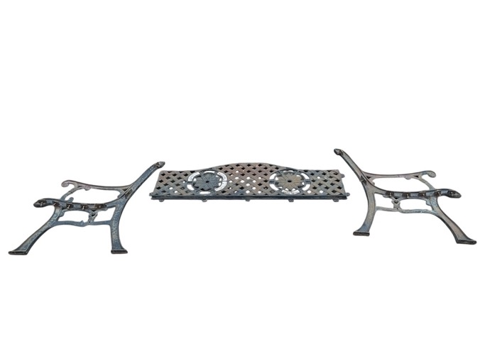 A dismantled cast iron garden bench with arched latticework back panel having two flowerhead medallions, on scrolled ends with tapering sabre legs. (A/F)