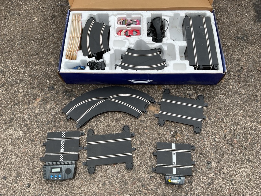 A boxed Le Mans Scalextric set with two coupe cars, track, controllers, racetrack signs, etc.