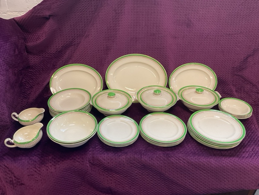 An Alfred Meakin dinner service with gilt & green borders - tureens & covers, gravy boats, ashets, bowls & plates, etc. (A lot)