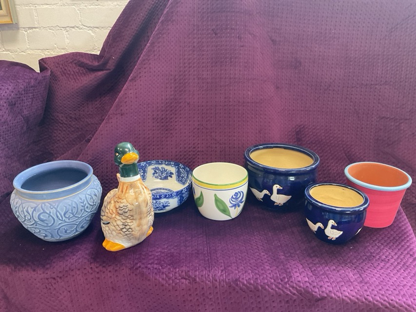 A Doulton blue & white bowl decorated with baskets of fruit; and miscellaneous jardinières, plant pots, etc. (A lot)