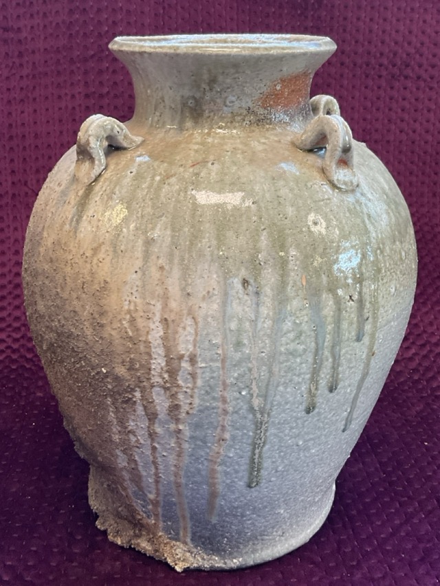 A large studio pottery stoneware jar with waisted neck having four loop handles applied to shoulder, decorated in unusual running and roughcast glaze. (15in)