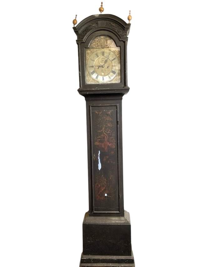 A C18th chinoiserie lacquered longcase clock by David Lestourgeon of London, with gilt ball finials on arched cornice and fretwork frieze above a brass dial with embossed crest, roman chapter ring and cast mask spandrels, the trunk with rectangular door and moulded base on a plinth - A/F. (92in)