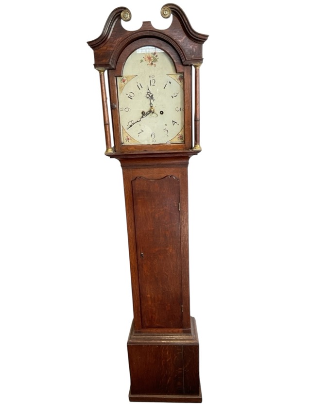 A C19th oak longcase clock with swan-neck pediment above an arched painted dial with arabic chapter ring and floral spandrels flanked by turned columns, above a trunk with shaped door and moulded base on a plinth. (82.25in)