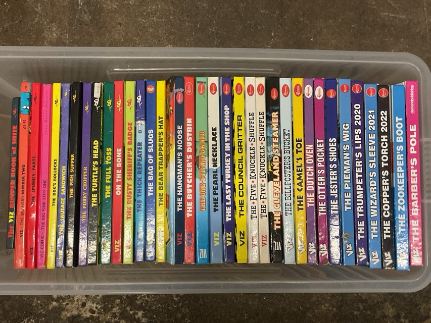 A collection of hardback Viz annuals from the late 1980s to 2023, with comedy cartoons, articles, letters, etc. (35)