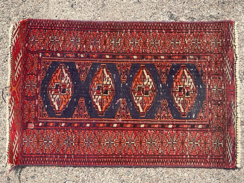 A Turkmen wool rug woven with four panels gul medallions on a dark blue field within stylised flowerhead borders. (34in x 22in)