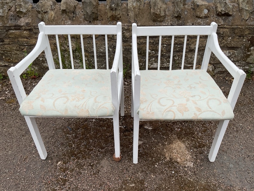 A pair of painted wood armchairs with spindle backs and rounded arms, having cushion seats raised on rectangular legs. (2)
