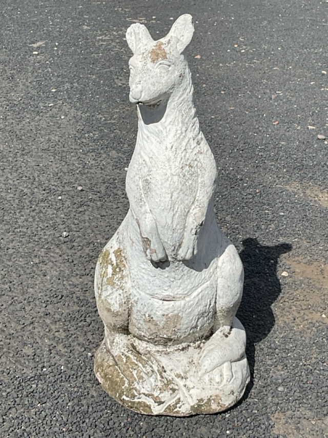A painted composition stone model of a kangaroo, the seated garden animal on an oval plinth. (22in)