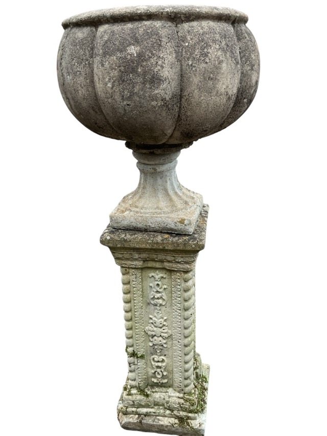 A composition stone urn on an associated stand, the fluted bowl on square plinth, the column support with stylised scrolled panels framed by ropetwist borders, on square moulded base. (40.25in)
