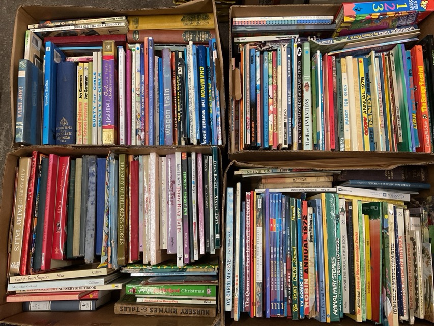 Four boxes of toy reference and childrens books - doll and toy collecting, Christmas books, stories, novels, poetry, cartoons, history, annuals, anthologies, Enid Blyton, etc. (175)
