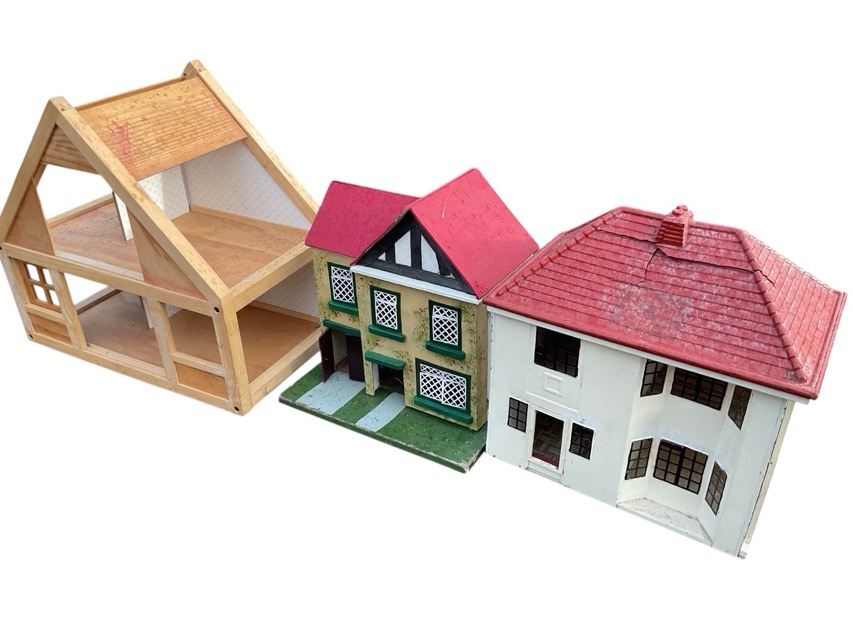 Three dolls houses - metal with sliding front, a timbered type house, and modern open plan building. (3)