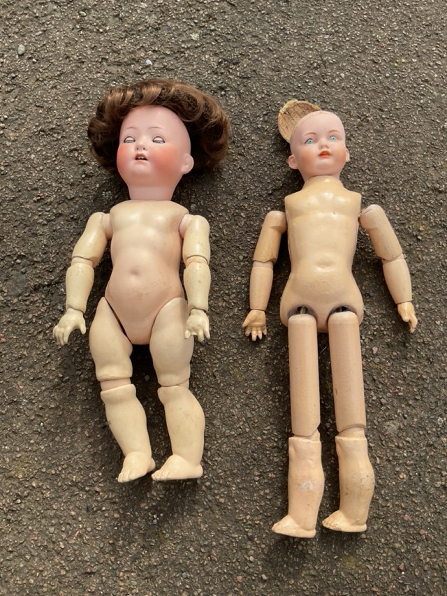 A 15in German porcelain head doll by Heubach Koppersdorf with later wig, sleep eyes and open mouth on an articulated composition body; and an 18in English porcelain head doll by the Diamond Porcelain Co with painted eyes and closed mouth on an articulated composition body. (2)