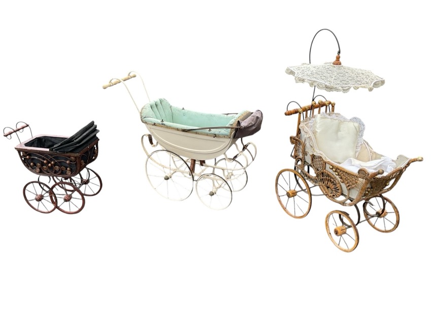 Three Edwardian dolls prams - a small wrought iron with fabric folding hood, a double with painted boat shaped body and fabric subshade, and a elaborate cane bodied with suspended lace parasol. (3)