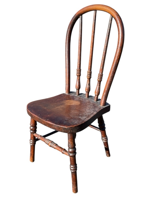 An antique childs windsor type oak chair with hooped back on ring-turned spindles, the solid seat on turned legs & stretchers.