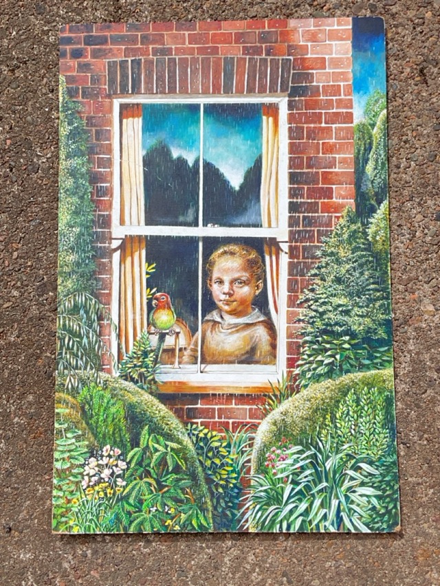 Manuella Norris, oil on board, a boy and parakeet looking out of a window into the garden on a rainy day, unsigned. (15.75in x 24in)
