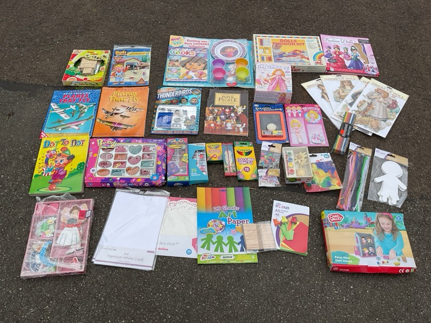 A collection of childrens activity sets and craft materials - paper dolls, a bead kit, muffin making set, paper aeroplanes, painting & wood model kits, packs of card, plasticine, crayons, coloured pencils, goggly eyes, gem crafts, etc. (A lot)