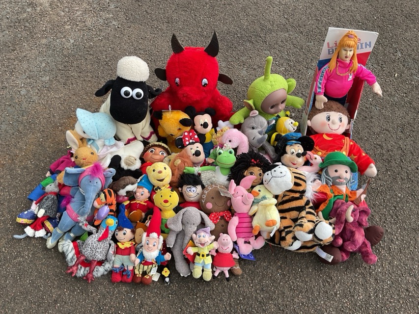 Miscellaneous soft toys - elephants, tigers, frogs, birds, rabbits, bears, Mickey mouses, teletubbies, Noddys, Winnie the Pooh characters, Sooty, Shaun the Sheep, Beatrix Potter, Jellycat, Ty, Disney, etc. (A lot)