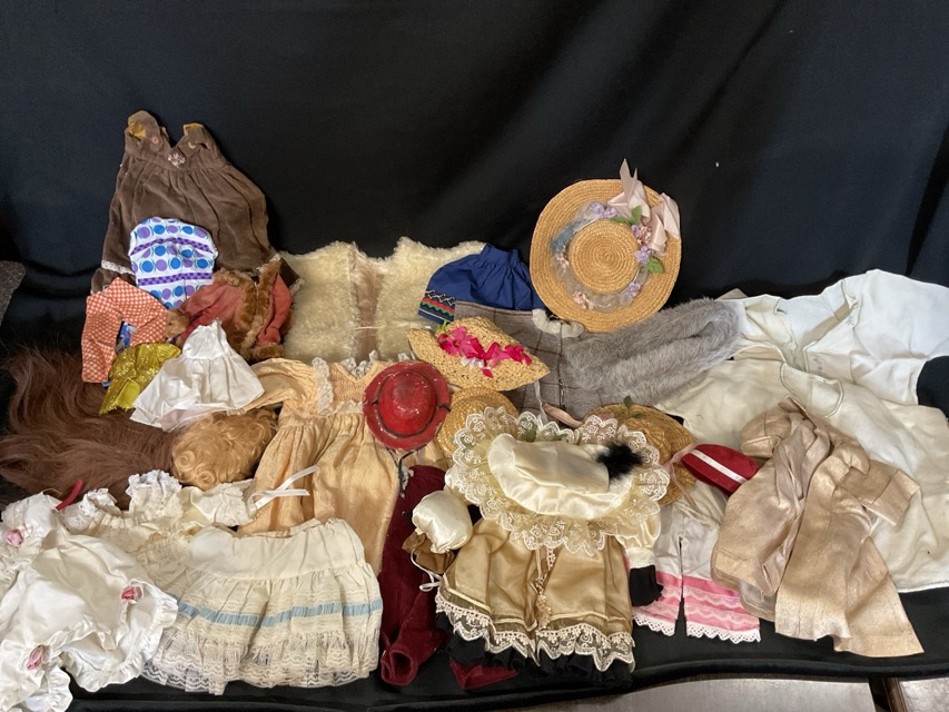 Miscellaneous dolls clothes - dresses, lace, pantaloons, straw hats, faux fur, wigs, jackets, bonnets, trousers, etc. (A lot)