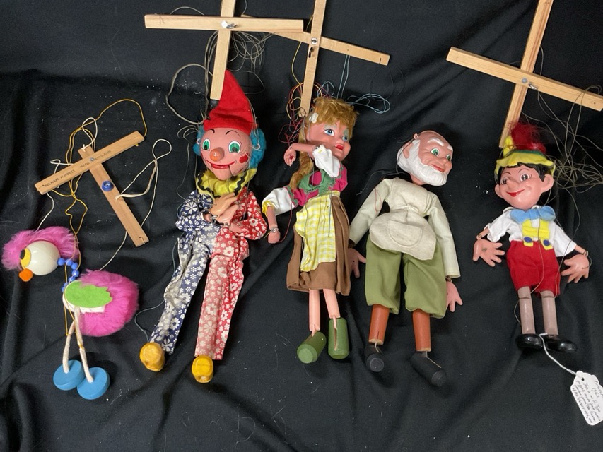 Five Pelham puppets - an SL Type Pinocchio, a Gepetto without strings, Gretel, a clown, and a pink ostrich marionette. (5)